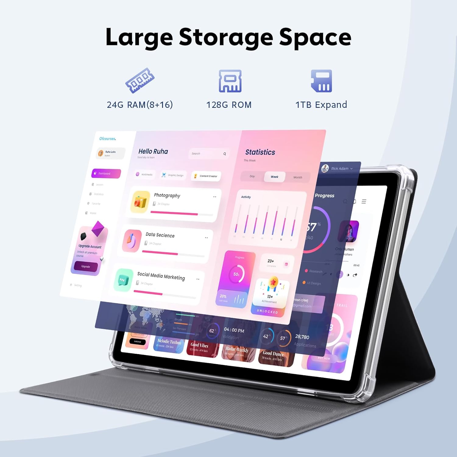 - 【Massive Storage】 Experience quick app launches and smooth operation with this android 15 tablet's substantial 24GB RAM (8+16) and 128GB storage (expandable to 1TB via microSD card - card not included). Download your favorite apps like TikTok, Facebook, and Twitter effortlessly from the pre-installed Google Play store (SIM Card Not Supported)